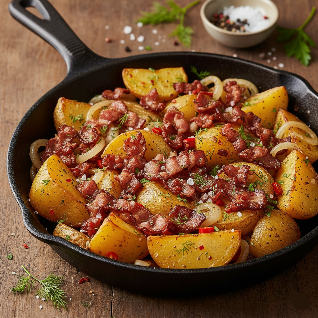 Этот гарнир — та самая «палочка-выручалочка», когда хочется превратить обычный ужин в маленькое застолье. Золотистые ломтики картофеля с поджаристой корочкой и ароматом копченого бекона — это беспроигрышный вариант, который нравится всем. Текстура получается ресторанная: снаружи — уверенный хруст, внутри — мякоть, пропитанная дымком. Это блюдо станет идеальным напарником к любым котлетам, тефтелям, гуляшу или мясу в соусе, добавляя тарелке нужную «хрустинку», но поверьте — эта картошечка улетает со стола и просто так, вприкуску с соленым огурчиком. Шаг 1. Подготовка базы (Варка)