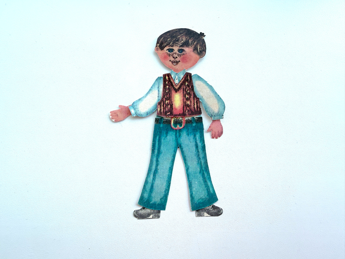 Через год после появления на свет Кати в Весёлых картинках напечатали другую бумажную куколку - мальчика Петю: Петя, конечно, парень хоть куда! И нарядов у него хватает, и комплектовать их можно. У Пети даже есть охотничий костюмчик! Не знаю, почему-то именно так мне его хочется назвать, с бриджами, резиновыми сапогами и клетчатой кепкой а ля Шерлок Холмс: Петя вообще прямо настоящий английский аристократ. Осенью охотится, летом играет в теннис (кроссовок правда нет, ну да что уж там): А ещё Петя любит кататься на коньках, он и на скорость в них бегает и умеет разные фигуры делать, тулуп там, флип, лутц. А также аксель, сальхов, риттбергер (это я Олимпиаду одним глазком смотрела, и записывала всё, что там рассказывали про фигурное катание): А ещё рядом с Петиным поместьем есть речка и озеро. Зимой, когда она замерзает, он выходит с ребятами из соседней деревни покататься на открытом льду. Но тут уже утепляется - надевает шапочку, варежки, шарф: Летом Петя любит отдыхать на море. Для эт
