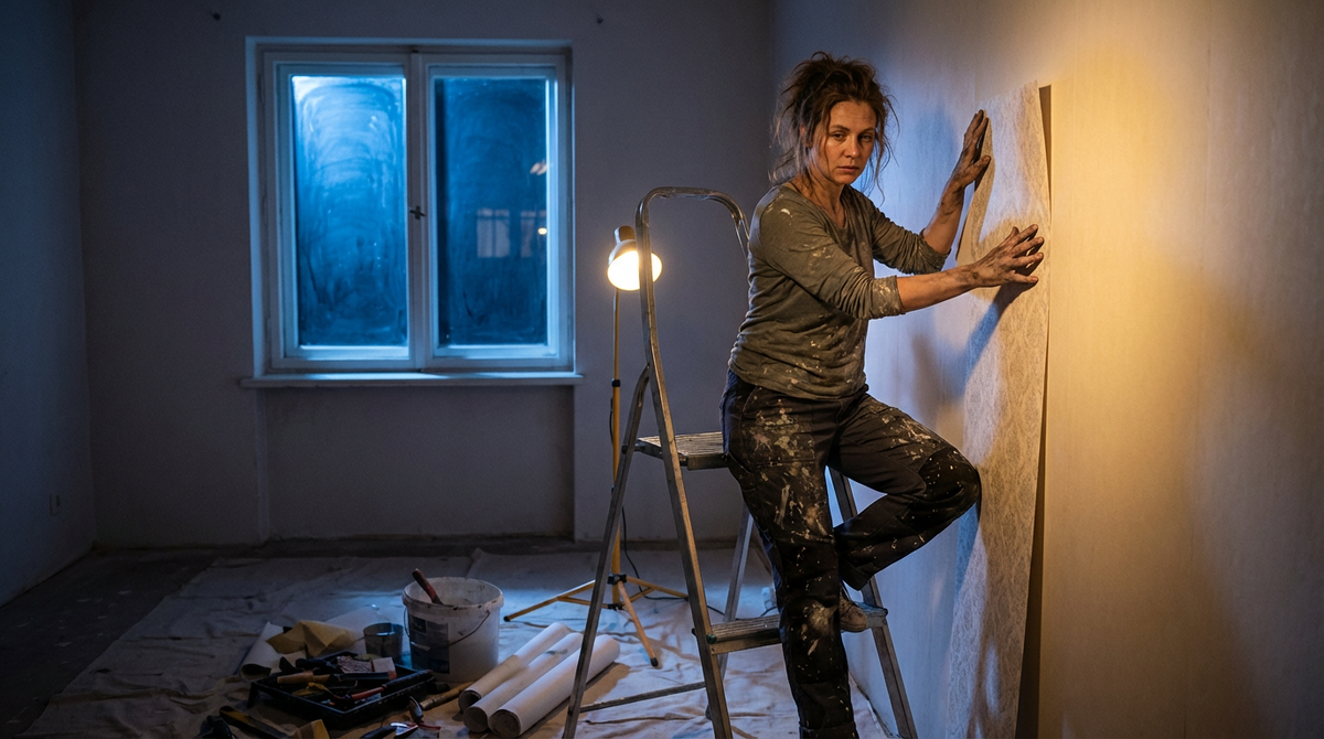 Четыре часа. Я стояла на стремянке четыре часа. Мазала клей, ровняла полосы, разглаживала пузыри. Руки в клее. Спина ноет. Колени — в синяках от стремянки.