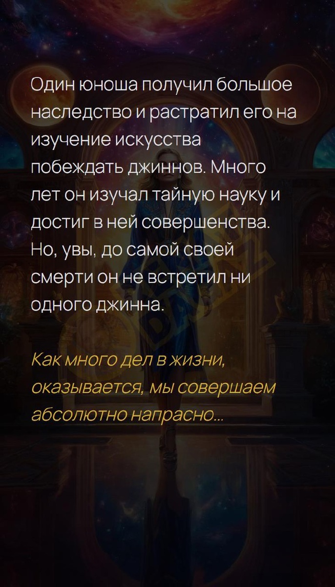✨ Один юноша получил большое наследство и растратил его на изучение искусства побеждать джиннов. Много лет он изучал тайную науку и достиг в ней совершенства. ✨ Но, увы, до самой своей смерти он не встретил ни одного джинна. ✨ Как много дел в жизни, оказывается, мы совершаем абсолютно напрасно… Архитектура вашей души | Архитектура вашей души T | VK | Pin | YouTub | Dzen #денежныйпоток #кодсчастья #глубиннаяпсихология #чудокаждыйдень #счастливаясемья #здоровье #суть #психологияжизни #эволюция #6число #6февраля