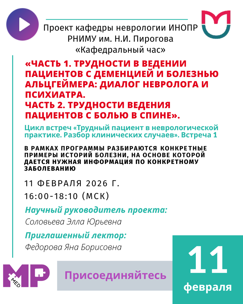 Уважаемые коллеги, приглашаем вас принять участие в проекте кафедры неврологии ИНОПР РНИМУ им. Н.И. Пирогова Кафедральный час.