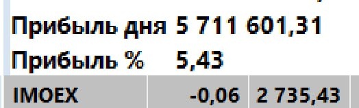 Индекс в минусе, портфель в сильном плюсе. На самом деле это просто плюсовой день и портфель болтается ровно там же где был на хаях рынка. Но в этом то и главное достижение после отката рынка на несколько процентов. В клубе уже написал что сам буду делать если рынок добьём коррекцию до 2650. ☝️Что тут надо понимать в целом - то что даже если мы добьём до 2650 это всего 2% вниз по рынку. Если туда упадём без просадок по портфелю то на обратном росте будет охренный профит. При уходе к 2650 движение стоит рассматривать как возможность для покупки. ☝️Ну и главное на таком рынке это то, что понимает каждый профессиональный трейдер - главное не шортить. На каждый успешный локальный шорт будет куча людей которые в шортах полягут если будут новости, особенно в неторговое время. (Особенное внимание обращайте на то если вам про успешные шорты или лонги задним числом кто-то рассказывает) Пока как то так.