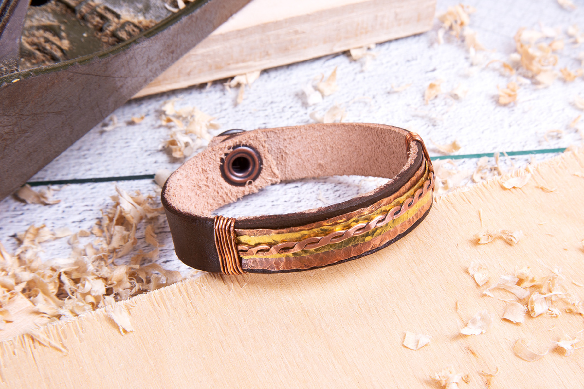 Давайте прервем бесконечный забег в поисках «чего-нибудь на 23 Февраля». И уж точно не стоит в отчаянии хвататься за банальные наборы «до/после бритья» и носки (пусть даже прикольные и всегда нужные). Наши мужественные защитники тоже нуждаются в любви и поддержке, а эти чувства лучше всего выразит подарок, сделанный руками. Собрали для вас в «Леонардо» готовые идеи с пошаговыми инструкциями по созданию вещей с неповторимым характером. С юмором и долей романтизма, брутальные и элегантные –любимым мужчинам посвящается! Никакой хрупкости и эфемерности – только весомость металла, точность чеканки, запах натуральной кожи и теплота пробки. Такие подарки подойдут мужчинам, которые ценят надежность и функциональность, ценят в вещах историю. Не бойтесь, если никогда раньше не работали с кожей и металлом: в начале каждого мастер-класса приведены полные списки инструментов и материалов для работы, а каждый шаг поясняется фото. Браслет из кожи с чеканкой вполне можно сделать за день-два. На фото: