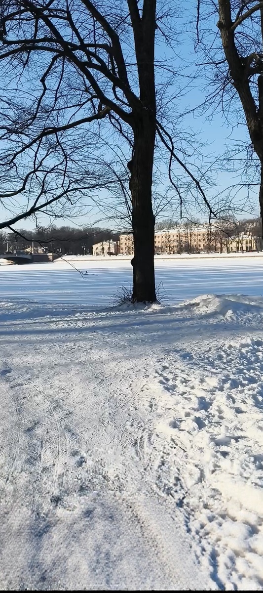 Обе Невки покрыты льдом и припорошены снегом. На льду следов полно. Какой-то транспорт ехал, может на воздушной подушке катер, судя по следу. И шальной лыжник бежал коньковым ходом. Вот отчаянный спортсмэн. А какой-то охальник, видимо под покровом ночи, натоптал неприличную картинку, яйки с морковкой. Развлекается и резвится народ, кто во что горазд.