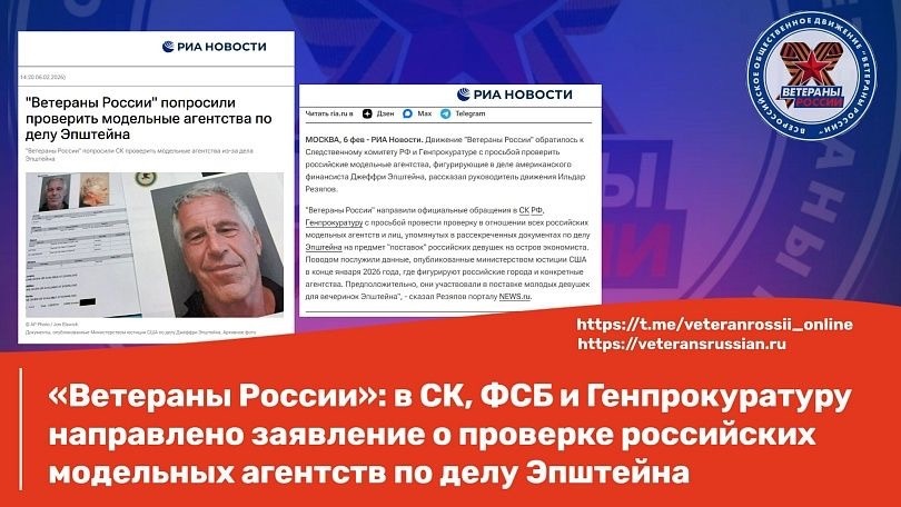 Общероссийское общественное Движение «Ветераны России» направило официальные обращения в Следственный комитет РФ, Генеральную прокуратуру и ФСБ с просьбой провести проверку в отношении российских модельных агентств и лиц, упомянутых в рассекреченных документах по делу американского финансиста Джеффри Эпштейна. Поводом послужили данные, опубликованные Министерством юстиции США в конце января 2026 года, где фигурируют российские города и конкретные агентства, предположительно участвовавшие в поставке молодых девушек для «вечеринок» Эпштейна.