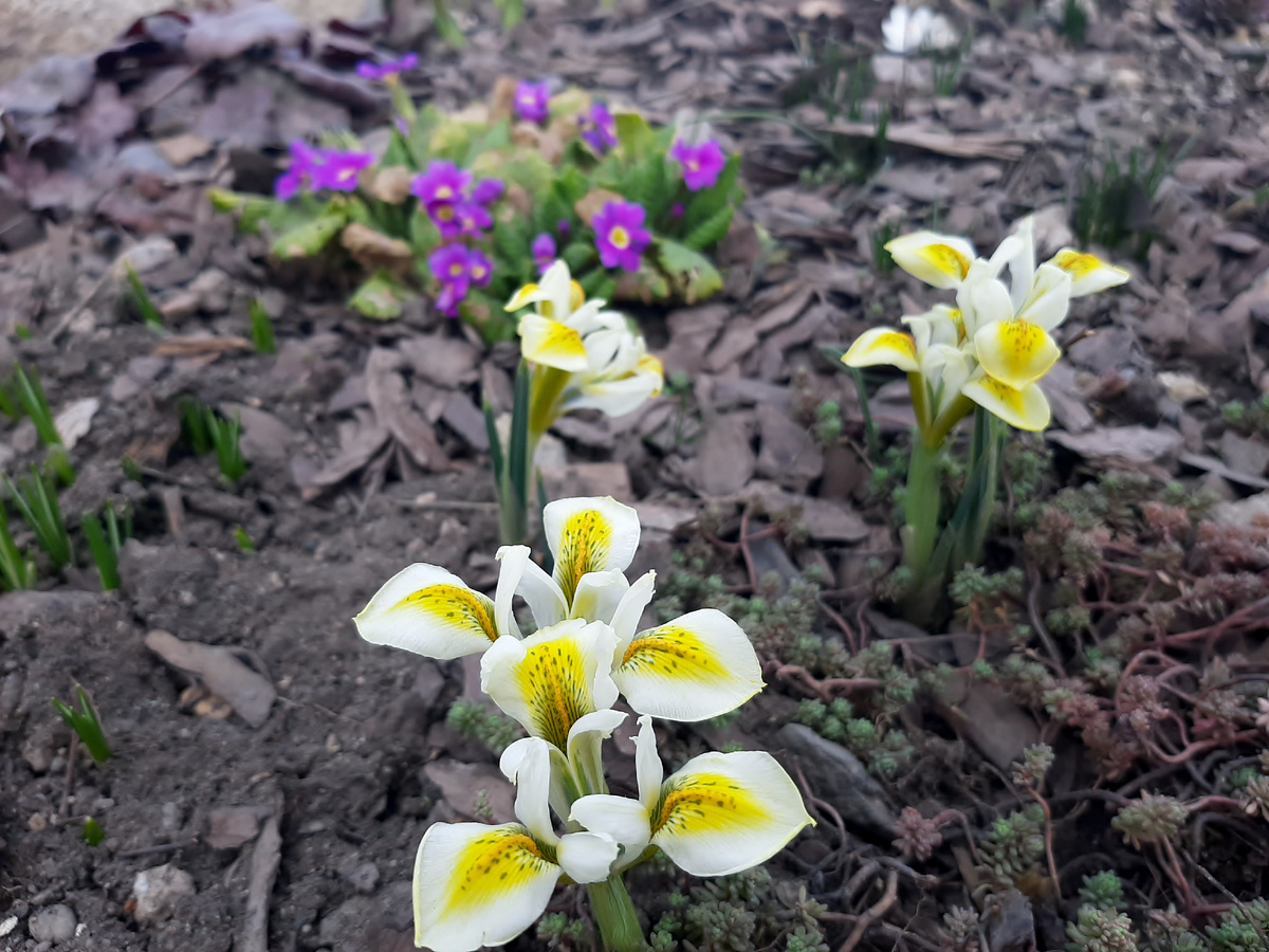 Температуру в нашем регионе изрядно бросает из крайности в крайность, сегодня +8, завтра -8. И теоретически никто не может подумать, что это выглядит ужасно, но тот, кто здесь живёт или попал в такой период на отдых на Кавказские Минеральные Воды, сразу по своим ощущениям поймёт, как нас здесь «колбасит». Ну, мы-то ладно, если накрыла головная боль, выпьем таблеточку и всё, а вот некоторые растения просто дезориентированы. Вот, к примеру иридодиктум North Star обескуражен, опознали мы его с Вами общими усилиями, за что всем отдельное спасибо. Он и в первый год после посадки зацвёл первым и сразу привлёк моё внимание, потому что именно этот сорт я не покупала и не ожидала увидеть. Должны были зацвести девять штук луковиц Eye Catcher, а зацвели только шесть, три из них оказались North Star и выяснилось, что цветут они первыми из первых. Я, не дрогнувшей рукой отделила «зёрна от плевел», то есть эти три луковицы отсадила и стала за ними наблюдать. Судя по цветению, нарастает их кламп непл