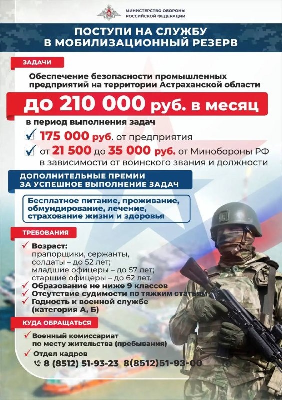 Министерство обороны приглашает для выполнения задач по защите промышленных предприятий региона ➖ Заработная плата – до 210 тысяч рублей ➖ Смена – длительность 2 месяца ➖ Полное обеспечение за счет предприятия (питание, проживание и тд.). ➖ Предприятия находятся на территории Астраханской области. Подробности можно по телефону: 8 (8512) 51-93-23 или 8 (8512) 51-93-00