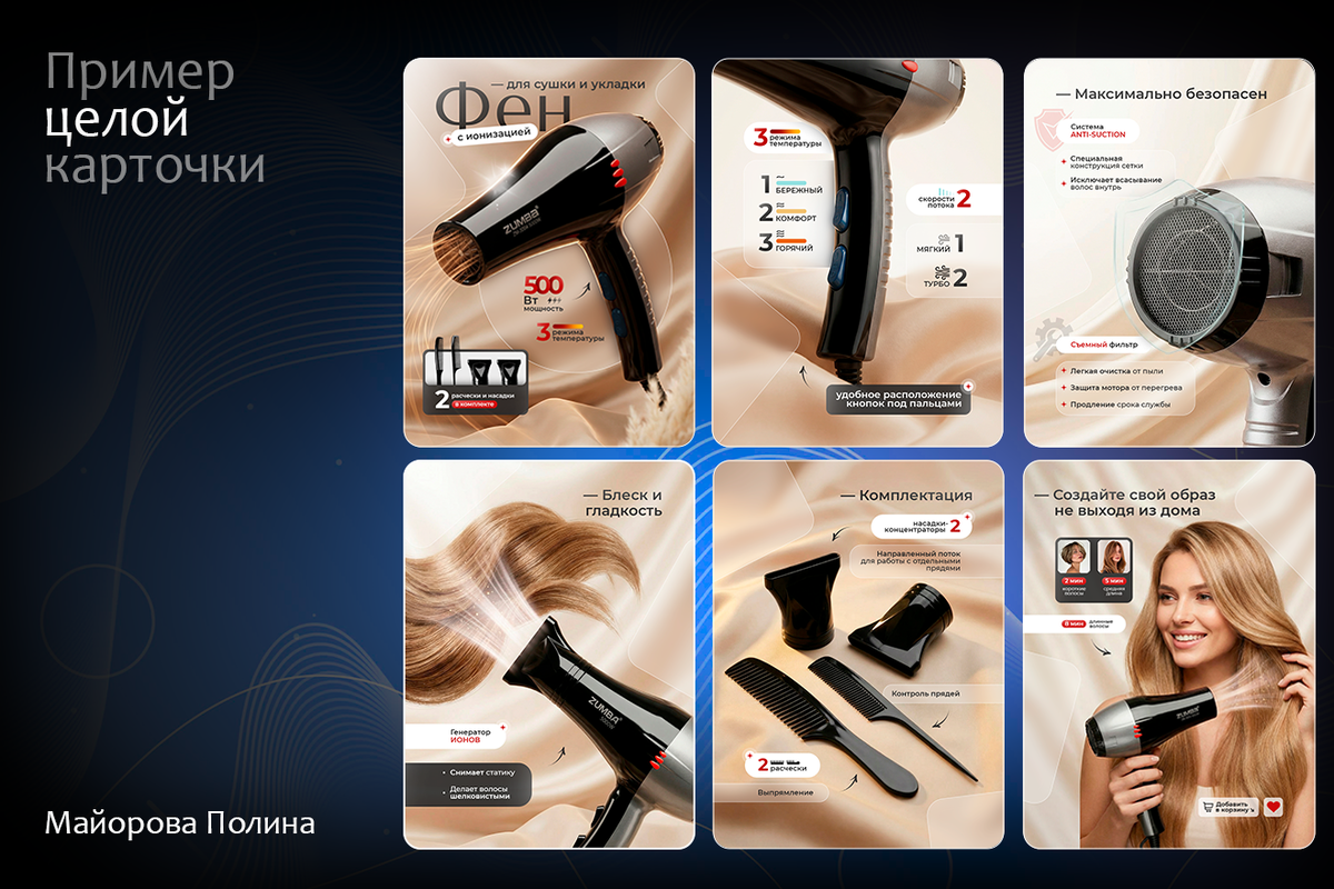 Нежность и технологии: новый кейс инфографики для фена Закончила работу над оформлением карточки товара для мощного фена. Здесь стояла задача не просто показать характеристики, а передать ощущение салонной укладки прямо через экран О воронке слайдов: Я выстроила повествование по классической схеме прогрева покупателя: 1. Захват внимания: Яркая обложка с ключевыми УТП 2. Рациональные доводы: Детальный разбор режимов и эргономики — показываем, что пользоваться им удобно 3. Закрытие страхов: Слайд про безопасность и защиту волос 4. Ценность: Демонстрация богатой комплектации и эффекта «шелка» на волосах 5. Call-to-Action: Эмоциональный финал с результатом и призывом к покупке Дизайн и атмосфера: Выбрала «дорогую» нюдовую палитру с золотистыми и бежевыми акцентами. Фоны имитируют шелковую ткань, что подсознательно ассоциируется с гладкостью и блеском здоровых волос Получился баланс между премиальным минимализмом и информативностью Нужен рабочий дизайн? Нажми на ссылку ниже, чтобы узнать по
