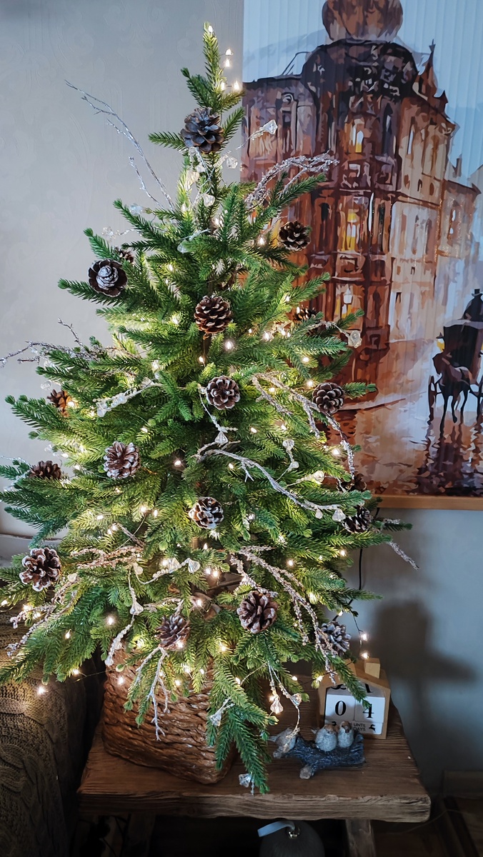 Заменила их на натуральные шишки. Оставила ледяные ветки и ветки с бусинками, чтобы добавляли лёгкости и воздушности ёлочке .