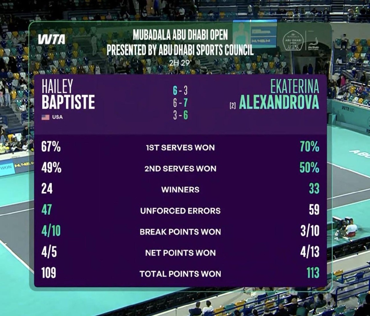 ⚡ WTA 500 Abu Dhabi SF: Александрова победила Баптист со счетом 3-6, 7-6(5), 6-3.