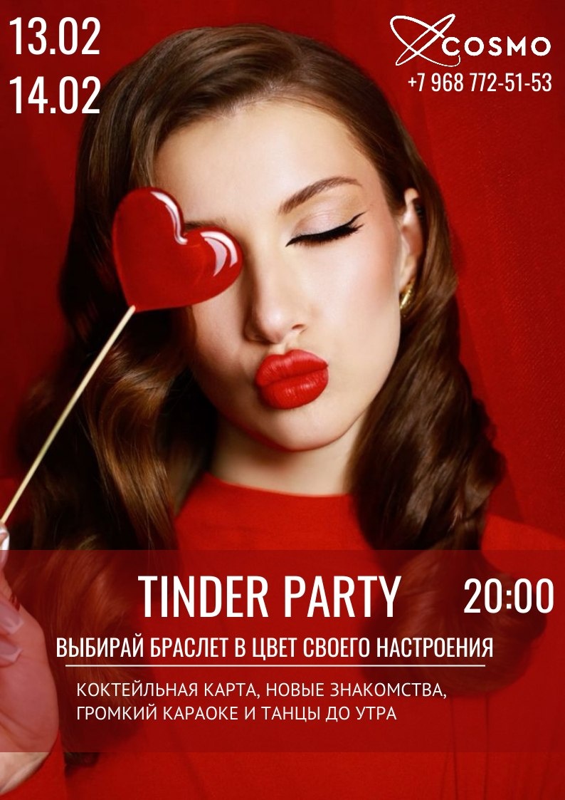 🥘 ❤ TINDER PARTY в COSMO ❤ 13 и 14 февраля | начало в 20:00 Вы готовы к новым знакомствам и ярким эмоциям? В эти дни COSMO становится местом, где флирт, танцы и хорошее настроение объединяются в одну незабываемую ночь ✨ 💫 Вас ждёт: — выбор браслета в цвет Вашего настроения — тематическая коктейльная карта 🍸 — новые знакомства и живое общение — громкий караоке и танцы до самого утра 💃🕺 Приходите с друзьями, вдвоём или в одиночку — здесь решает не алгоритм, а настоящая химия 🔥 cosmorest.ru/ 📞 +7 968 772-51-53 📶 Категория: Ресторан 🏢 Место: Ресторан-караоке "Cosmo" 📍Адрес: г. Подольск, Щербинка, ул. Кутузова, 12 БЦ Strotskis, этаж 5 ⏱ Часы работы: Пн-Чт: 12:00 – 23:00 Пт-Сб: 12:00 – 05:00 Вс - выходной. ✅ Где поесть, Подольск!? https://dzen.ru/id/6756016c107ef731969e16a5 https://vk.com/gde_poest_podolsk https://dzen.ru/gde_poest_v_podolske