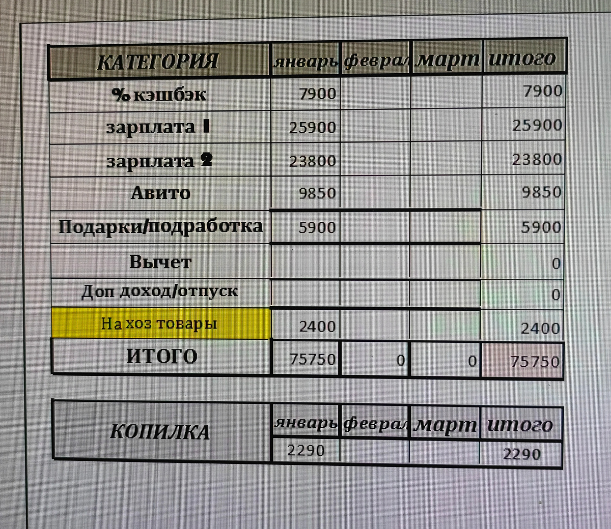 В Январе у меня было четыре распределения. Распределяла наши с мужем зарплаты, аванс и доход от продаж на авито.