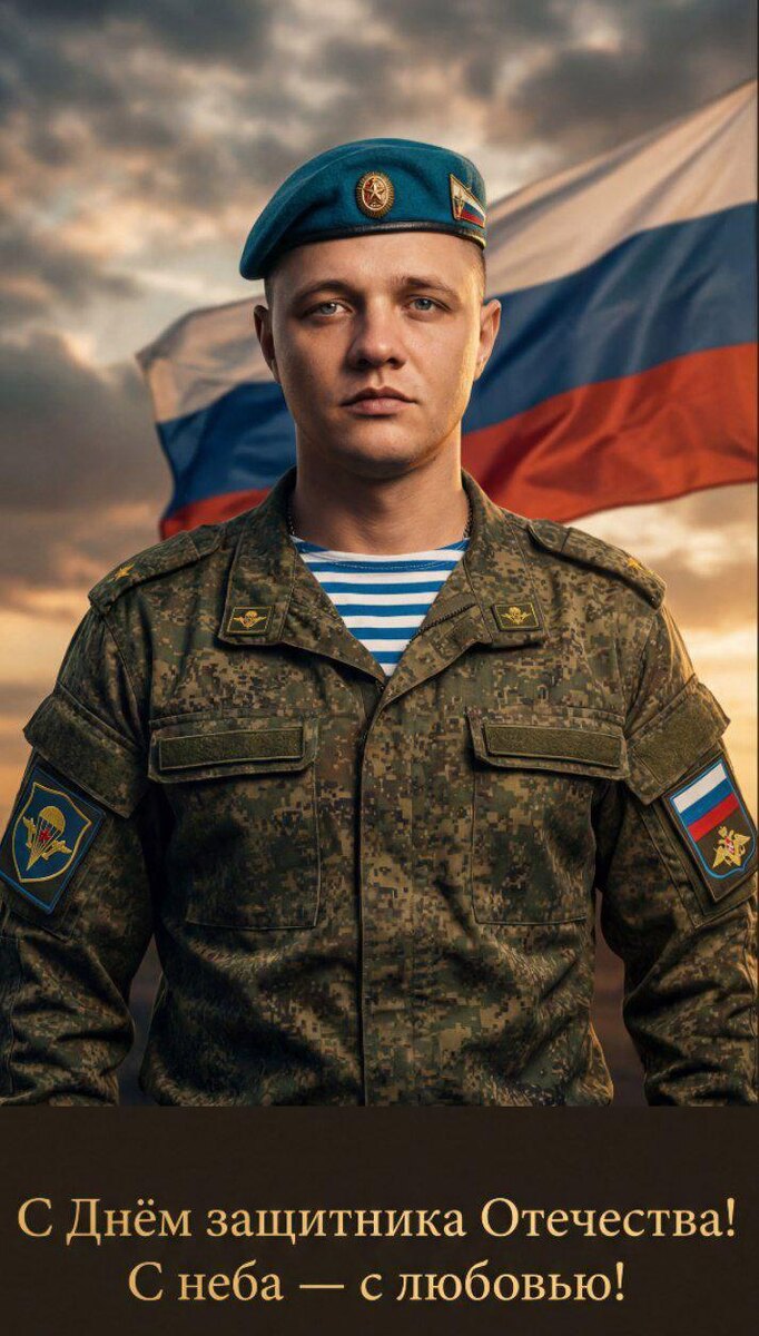 Модель: Nano Banana Сгенерировать🪄 Создать открытку к 23 февраля в стиле [кинематографический реализм], формат 1080×1500 px вертикально. Использовать загруженную фотографию мужчины, аккуратно вписать в форму военного подразделения [Воздушно десантные войска], в реалистичном и аккуратном стиле без карикатур, лицо сохранить узнаваемым. Цвета: военные, насыщенные, без кислотных оттенков. Сверху или снизу разместить поздравительный текст: “С Днём защитника Отечества! С неба — с любовью!”. В композиции не использовать оружие в агрессивной форме, без крови, без насилия, без политических лозунгов. Добавить флаг РФ и символику подразделения. Открытка должна выглядеть премиальной, подарочной, аккуратной. Без водяных знаков. На нашивках нет никаких надписей
