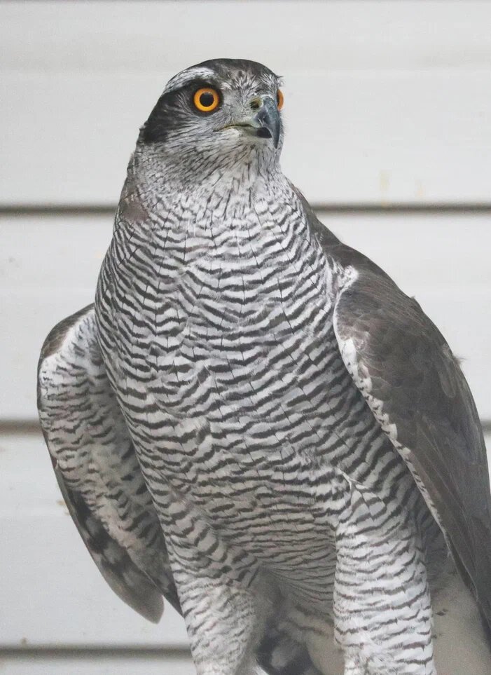 Вес: Самцы весят в среднем 0,5-1,1 кг, а самки – 0,8-2 кг. - Оперение: Окраска ястреба-тетеревятника варьируется в зависимости от подвида и возраста, но в целом имеет характерные черты.Взрослые птицы: Верхняя часть тела обычно темно-серая или буроватая, с более светлым, часто пепельным оттенком на спине. Нижняя часть тела светлая, с поперечными темными полосами или пятнами, которые могут быть более выраженными у самок. Голова имеет темную "шапочку" и отчетливые белые "брови". Глаза у взрослых птиц обычно оранжевые или красновато-оранжевые.