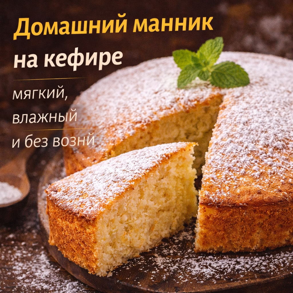 Ставлю в разогретую духовку до 180 °C на 40–45 минут. Готовность проверяю деревянной шпажкой — она должна выходить сухой. Манник: Отличный вариант, когда хочется домашней выпечки без сложных рецептов. Если хочется разнообразия, в тесто можно добавить: А сверху готовый манник хорошо посыпать сахарной пудрой или полить вареньем