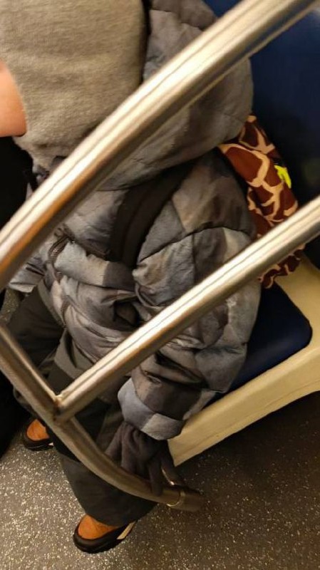 ) На улице морозы, поэтому одежда, конечно, соответствующая. Все логично. Но в метро сидеть вот в этом ребенку… свариться же можно. Помню, своему еще на входе снимала шапку, куртку и тд. Это ж не сложно, просто в руках держать. *** Не забывайте адаптировать одежду в любом транспорте.