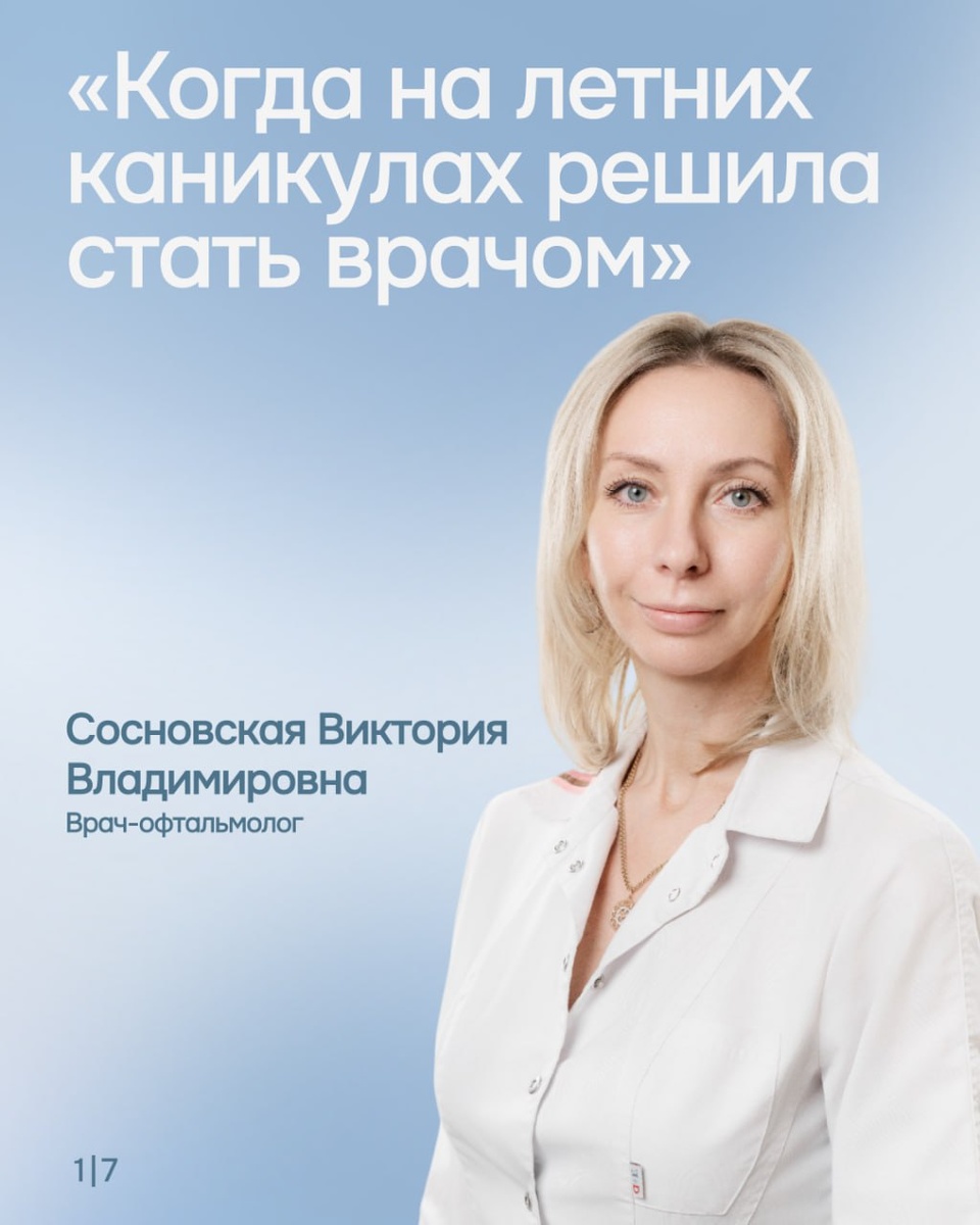 ? В карточках наш врач-офтальмолог, Сосновская Виктория Владимировна, поделилась своей историей пути в медицину: от летних каникул в окружении родных до осознанного выбора офтальмологии и любви к специальности. Немного о работе с пациентами, принципах и частых мифах, а также немного не по протоколу: активный отдых, забота о природе и жизнь вне кабинета. Листайте и знакомьтесь с Викторией Владимировной 👆 Аккуратно, может появиться желание записаться. Это всегда можно сделать на сайте. 👀