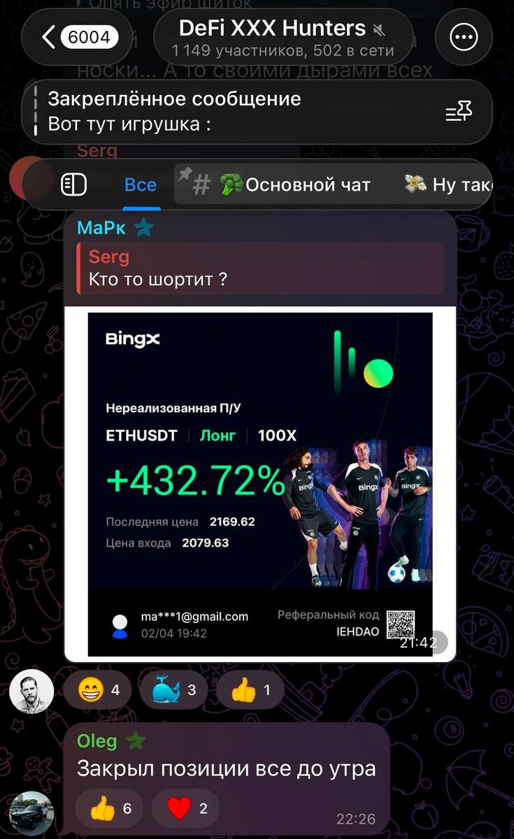 100Х. И это НЕ демо. Пока кто-то спрашивает - Хантеры уже фиксируют профит 💸 📈 Реальные сделки ⚡️ Быстрые входы 🧠 Чёткая логика, а не «пальцем в небо» 🤝 Комьюнити, где зарабатывают, а не ноют Это DeFi XXX Hunters - чат, куда заходят до движения, а не после скринов. 🔥 СЕЙЧАС АКТИВНЫ СКИДКИ НА ВСТУПЛЕНИЕ Да, именно сейчас. Да, потом будет дороже. Да, места ограничены. ⏳ Рынок не ждёт. 💥 Возможность - тоже. 👉 Врывайся в Чат Хантеров прямо сейчас Пока ты думаешь кто-то уже закрывает +300% 🤷♂️ Не смотри скрины. Стань их автором. 🚨 Торопись. Скидки скоро закроются. ВСТУПИТЬ