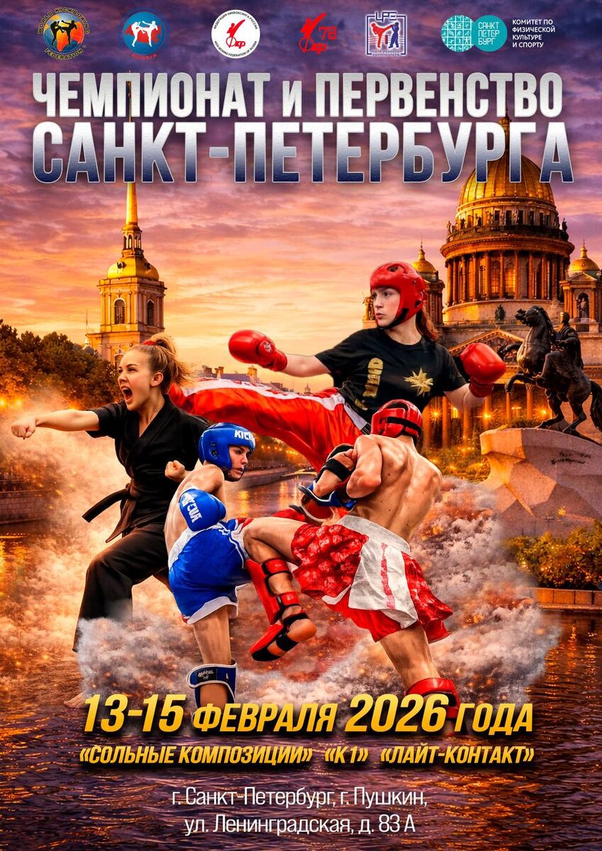 !👊 🤩 Турнир пройдёт на базе СШОР Пушкинского района. Соревнования станут важным этапом в формировании сборной команды Санкт-Петербурга для участия во всероссийских соревнованиях 2026 года. Всего будет разыграно 178 комплектов медалей в дисциплинах «лайт-контакт», «сольные композиции», «К1». 🎉 14 февраля в 15.00 состоится торжественное открытие соревнований, а с 11.00 по 21.00 будут проходить предварительные поединки. 15 февраля с 11.00 по 19.00 пройдут финалы, а также награждения победителей и призёров. 🗓 14-15 февраля 2026 года 📍 г. Пушкин, ул. Ленинградская, д. 83 А 🙌Будь ВСпорте!