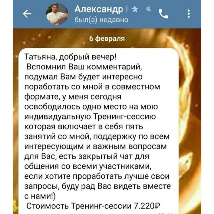 Это не я! Если вам приходят подобные предложения, блокируйте их и не обращайте на них внимания. Если у вас есть какие-либо сомнения, пишите мне напрямую или моей помощнице. Напоминаю: я никогда не делаю скидок на личные консультации и не рассылаю предложения о консультациях в личные сообщения! Спасибо неравнодушным и бдительным подписчикам, которые сообщают о подобных случаях. 🙏 Кому уже успели написать? Получали такие сообщения?