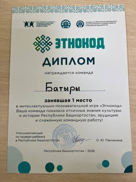 этнокод». Команда нашего лицея «Батыры» блестяще справилась со всеми испытаниями! Ребятам предстояло отвечать на самые разные и интересные вопросы о нашей родной Республике Башкортостан: её истории, культуре, традициях, выдающихся личностях, природе и современности. Их знания, эрудиция и слаженная работа принесли заслуженную победу — ПЕРВОЕ МЕСТО! Это значит, что наша команда теперь будет представлять Учалы на финале конкурса, который пройдёт в столице республики — городе Уфа! Мы от всей души поздравляем наших победителей и их наставников! Желаем не останавливаться на достигнутом! Вперёд, «Батыры»! Гордимся вами! #Учалы #Батыры #Этнокод #БашкирскийЭтнокод #Башкортостан Источник https://uchaly102.ru/?p=123827