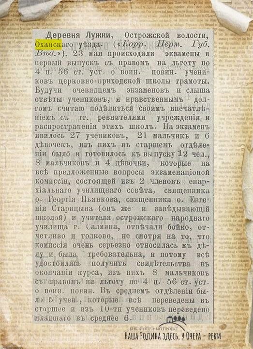 Источник: Пермские губернские ведомости .- 1894.- 23 июня 23 мая состоялись экзамены и первый выпуск с правом на льготу по 4-му п. 56-й статьи Устава о воинской повинности учеников церковно-приходской школы грамоты. Будучи очевидцем экзаменов и слыша ответы учеников, я считаю своим нравственным долгом поделиться впечатлением с господами ревнителями учреждения и распространения этих школ. На экзамен явилось 27 учеников: 21 мальчик и 6 девочек. Из них в старшем отделении было и готовилось к выпуску 12 человек (8 мальчиков и 4 девочки), которые на все предложенные вопросы экзаменационной комиссии отвечали бойко, отчетливо и толково. Комиссия, состоящая из двух членов епархиального училищного совета – священника о. Георгия Пьянкова, священника о. Евгения Старицына (он же и заведующий школой) и учителя Острожского народного училища г. Салмана, очень серьезно относилась к делу и была требовательна. Поэтому все удостоились получить свидетельства об окончании курса, из них 8 мальчиков – с прав
