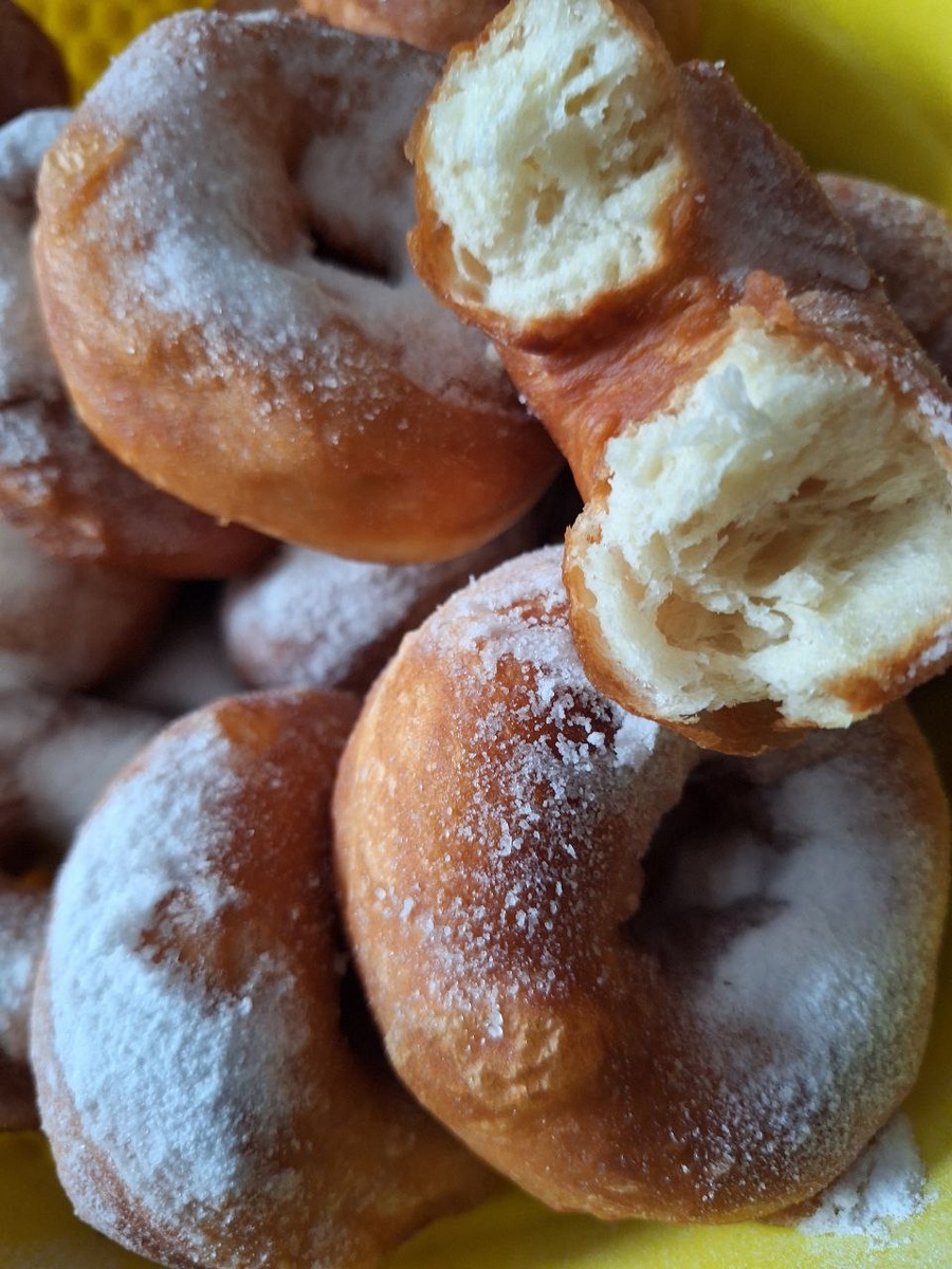 Приготовление: Соединить теплое молоко, воду, соль, сахар, дрожжи, яйца и муку. В процессе вымешивания тесто постепенно добавлять мягкое сл. масло. Готовое тесто смазать раст.маслом, накрыть и оставить в теплом месте минимум на 1 час, в идеале лучше на 2 часа. Тесто обмять, разделить на 2 части, затем каждую на 10 кусочков. Скатать шарики. Выложить шарики на подпыленную мукой поверхность, накрыть пленкой и дать подойти 15 минут. В глубокой сковороде хорошо разогреть раст.масло. Формирование пончиков: в центре шарика сделать отверствие пальцем и слегка растянуть. Жарить пончики с двух сторон до румяного цвета. Жарить на среднем огне. Готовые пончики выложить на бумажные полотенца, затем - на блюдо. Еще теплыми посыпать сахарной пудрой и подавать. Приятного чаепития!