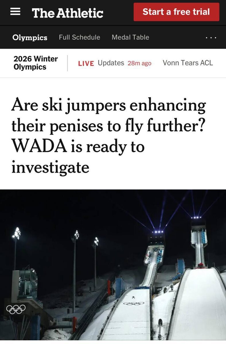 ! Ну наконец-то, свежие и интересные новости подоспели 😂😂😂 Глава Всемирного антидопингового агентства (WADA) Витольд Банька подтвердил, что агентство изучит сведения о потенциально новом виде технологического допинга в прыжках с трамплина. Речь идёт о публикациях в СМИ, утверждающих, что спортсмены могли прибегать к инъекциям гиалуроновой кислоты для увеличения объёма полового члена. Целью подобных манипуляций, как предполагается, является искусственное увеличение площади поверхности соревновательного костюма для улучшения аэродинамических характеристик (больший размер главного органа может увеличить прыжок более чем на 2 метра😱). Ранее немецкое издание Bild сообщало о такой практике при подготовке к контрольным замерам, по результатам которых подбирается экипировка.