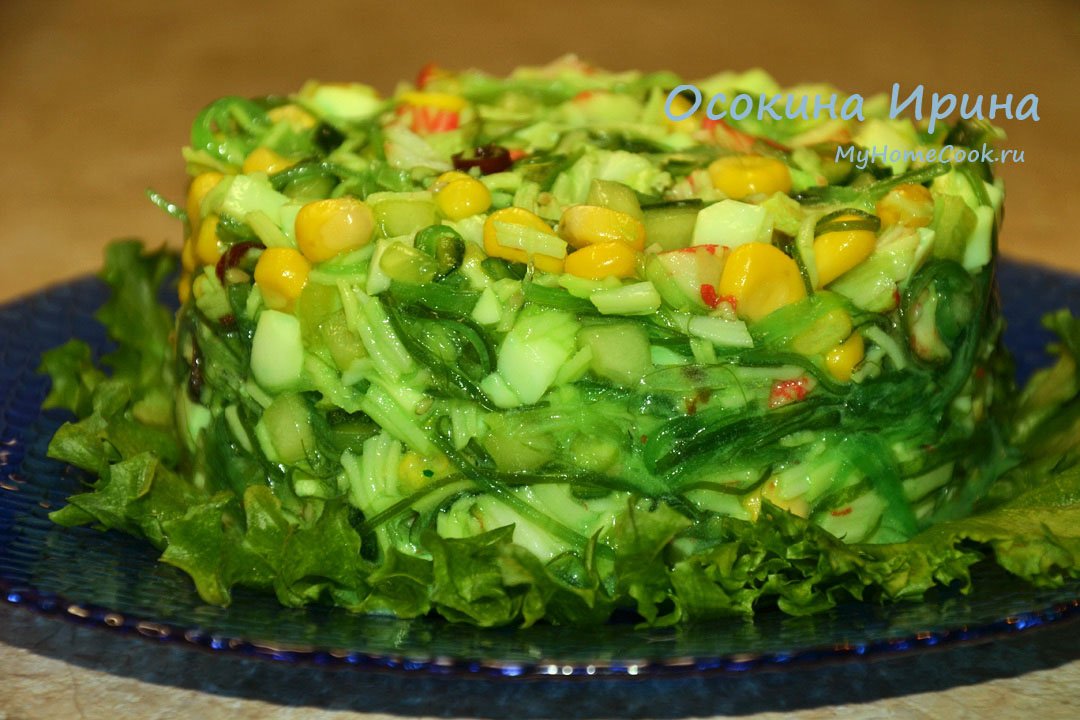 Салат насколько простой, настолько и необычный. Прошли новогодние праздники и захотелось чего-то и вкусного и полезного одновременно. Этот салат, по-моему, отвечает обоим критериям. Итак, порезала кубиком 1 длинный свежий огурец, 2 отварных яйца и 150 г крабовых палочек, добавила 1/2 банки консервированной кукурузы и 200 г готового салата "Чука" и промешала, заправила 1 ст.л. оливкового масла, промешала, немного настояла и подала. Простой и очень вкусный салатик) Приятного аппетита