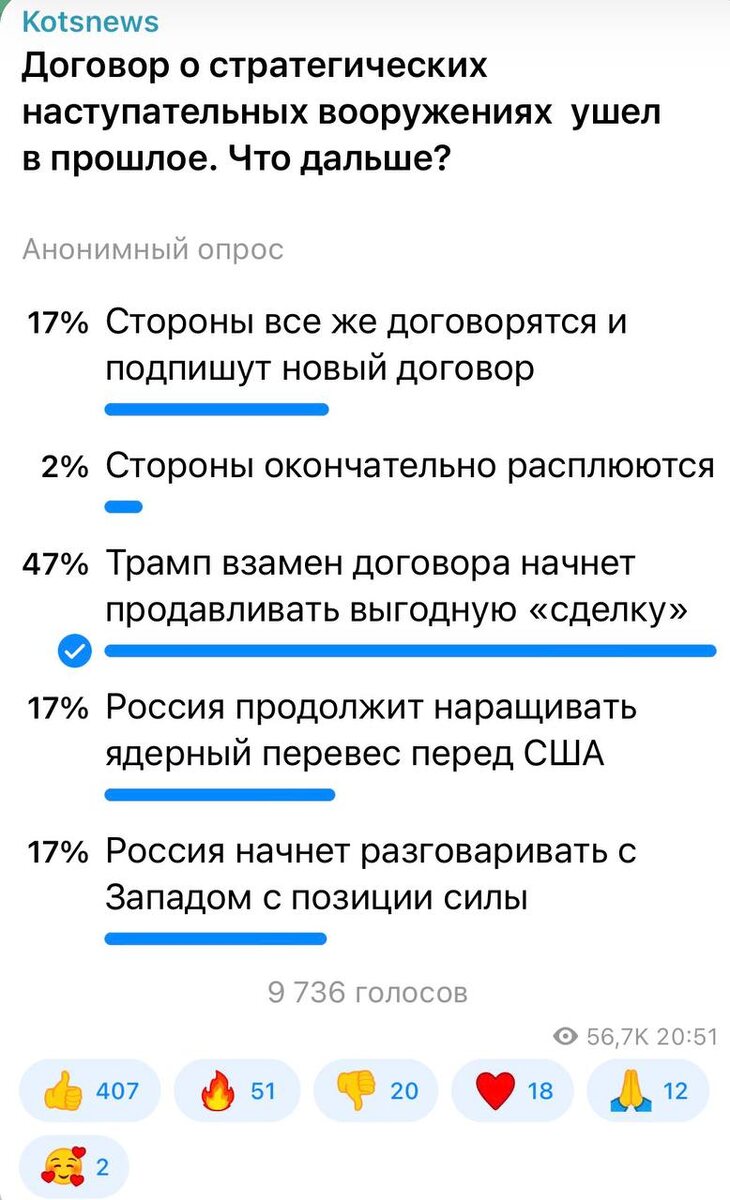 ⚡️⚡️⚡️ 47 процентов подписчиков считают, что Трамп начнет продавливать очередную сделку
