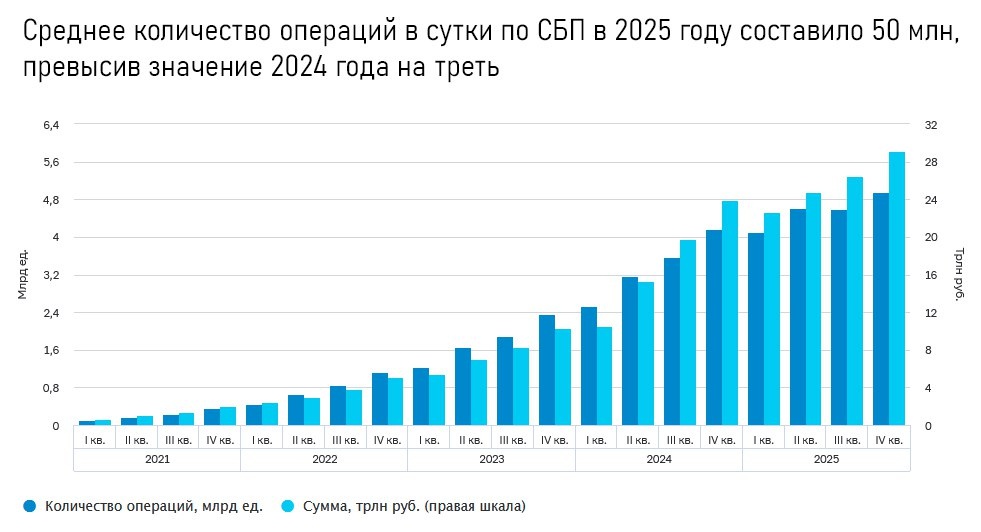 За 2025 год в России по СБП было совершено 18,3 млрд операций на сумму ₽103 трлн, что в 1,4 и 1,5 раза выше показателей 2024 года соответственно. Особенно активным оказался IV квартал: количество операций >4,9 млрд на сумму ₽29,1 трлн. В среднем за сутки 50 млн операций, что на ⅓ больше, чем в 2024 году. При этом 7 из 10 жителей страны активно пользовались переводами через СБП, а 5 из 10 оплачивали товары и услуги. Переводы между гражданами пока преобладают: в IV квартале их было совершено 3,4 млрд на сумму ₽25,9 трлн, причём 4 из 10 всех переводов производились между собственными счетами клиентов в разных банках. Оплата покупок через СБП также выросла. За квартал было совершено 1,4 млрд оплат на сумму ₽2,5 трлн со средним показателем 15 млн операций в сутки. Этому способствовало расширение сети приёма: количество предприятий, принимающих оплату через СБП, достигло 3 млн (из них 2,3 млн – малые и средние). За год юрлица совершили 244,6 млн переводов гражданам (например, страховые в