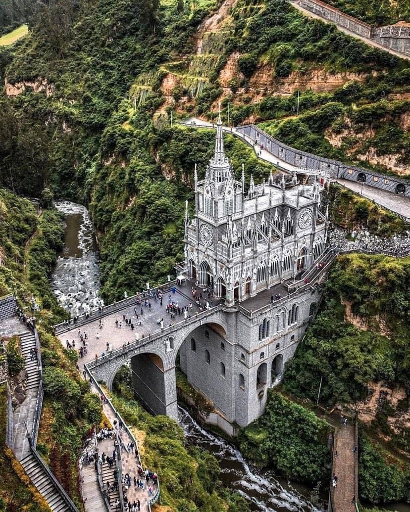 На изображении — церковь (святилище) Лас-Лахас (El Santuario de la Virgen del Rosario de Las Lajas) — одна из самых впечатляющих достопримечательностей Колумбии.