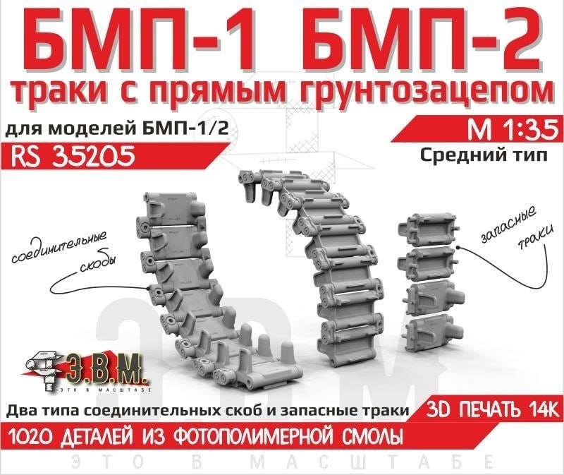 В.М. выпустила на 3D-принтере гусеницы с прямым грунтозацепом для моделей БМП-1/2 в масштабе 1/35: БМП-1, БМП-2 траки с прямым грунтозацепом (каталожный номер RS35205)