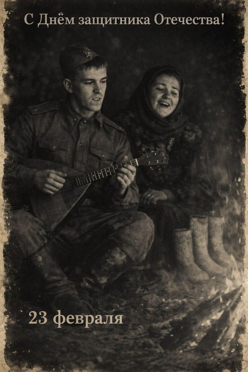 Модель: Nano Banana Сгенерировать🪄 Сгенерировать кинематографический снимок, соотношение 9:16, гиперреалистичное фото. Чёрно-белый снимок, слегка обгоревший по краям Молодой человек в военной форме 40х годов, с балалайкой в руках у костра, рядом сидит Лидия Андреевна Русланова, поют песни. Справой стороны стоят те самые валенки не подшиты стареньки. Сверху надпись с днем защитника Отечества. Снизу 23 февраля. Средний план, ночная обстановка. От костра идёт лёгкий дымок.