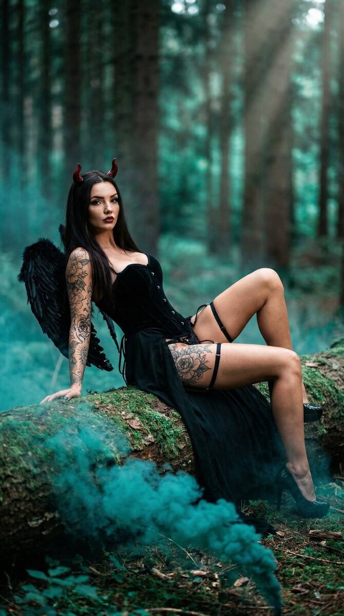 : Привет. Крис, извини, но я не смогла сдержаться и не попробовать тебя в этом образе🤭😄руки так и чесались 9:16. Using the uploaded reference photo, keep the facial features, bone structure, and skin tone 100% identical to the original. Do not change the shape of the face, its personality or expression; keep the skin texture and pores realistic, avoiding plastic smoothing. An ultra-detailed photorealistic scene depicting a Gothic demon woman lying on a mossy fallen log in a dark, dense pine forest, pale flawless skin contrasts with a deep black corset and flowing skirt, small red horns peek out of long raven-colored hair, wings of black feathers partially open, tattoos on sleeves and hips with exquisite floral and ornamental patterns, sultry dark makeup with maroon lips, garters on straps and high heels, turquoise smoke creeping low over a log, atmospheric volumetric light rays making their way through the trees, moody cinematic colors with turquoise and dark green tones, spectacu