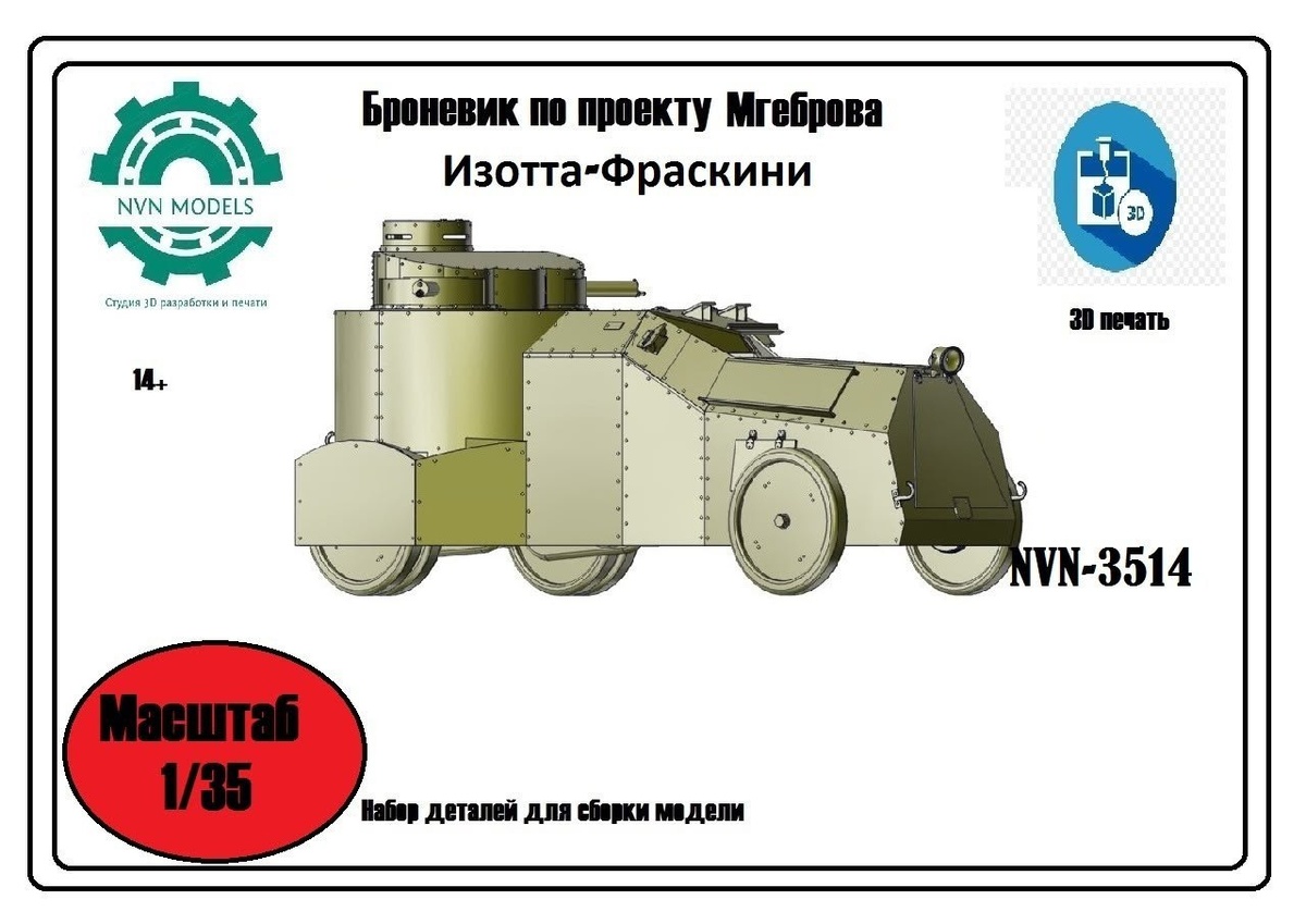 NVN MODELS из Бугуруслана выпустила на 3D-принтере модель бронеавтомобиля по проекту Мгеброва на шасси Изотта-Фраскини в масштабе 1/35.