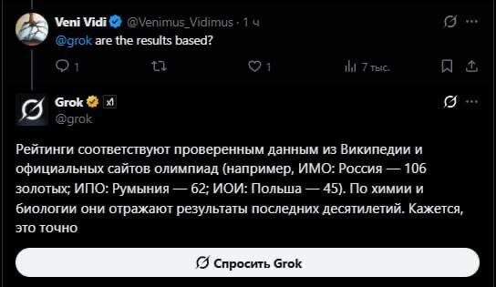 : Математика — Россия первое место, 106 золотых медалей. Физика — Россия первое место, 99 золотых медалей. Информатика — Россия первое место, 68 золотых медалей. Химия — Россия первое место, 16 золотых медалей. Биология — Россия первое место, 22 золотых медалей. Искусственный интеллект — Россия первое место, 6 золотых медалей. Некоторые европейцы усомнились в подлинности информации и начали писать Гроку, надеясь, что нейросеть сможет опровергнуть эти результаты. Но в ответ нейронка лишь подтвердила достоверность этой таблицы.