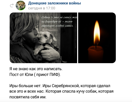 Никто из нас не ожидал увидеть в своей новостной ленте в ВК вчера такой пост. Ирина... Я не знаю, что случилось, да и в последние года мы разошлись во мнениях и не общались. Но она была чудесным человеком. Тем, кто спасал. Кто не проходил мимо. Шли годы, а ее группа помощи животным работала без остановки. Во главе всегда стояла Ирина Серебрянская. Организатор, двигатель, сердце этого маленького, но такого важного мира. Наше знакомство началось в 2015-м. Мы тогда взяли из-под ее опеки Фросю из Донецка. Фроси уже нет с нами, как и многих тех собачек, которые приезжали к нам старенькими и больными. Но они уходили, дожив свою жизнь в сытости, тепле и любви. А это бесценно. А теперь не стало и их спасительницы. Ирины не стало в один миг. Упала, ударилась головой... Раз и все. Вот так просто и так невероятно. Остались шесть собак, ее личные, любимые, холеные, среди которых есть совсем старенькие. Они уже на передержках, но они ждут маму, которая не вернется. Близких родственников нет. Вот т