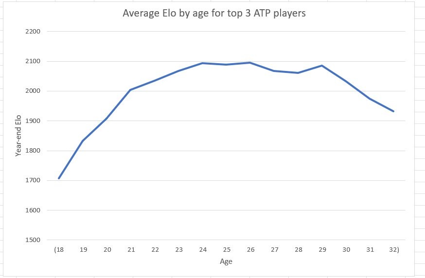 Интересный график с реддита: средний рейтинг Elo по возрасту для 17 лучших игроков ATP, достигших топ-3 с 2010 года.