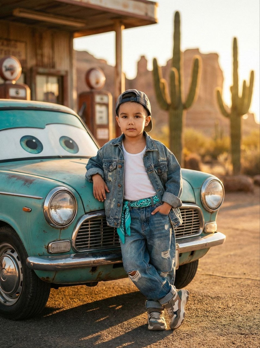 😀Выбираем "нейросети" 😀Нажимаем "Nano Banana" 😀Нажимаем "Nano Banana Pro" 😀Прикрепляем через скрепку свое фото и выбранный промпт 😀Наслаждаемся результатом😍 Создай фото не меняя черты лица и цвет волос. "Photoreal, golden‑hour desert portrait: ребёнок 5 лет опирается локтем на бирюзовый ретро‑автомобиль с мультяшными глазами на лобовом стекле, на фоне винтажной заправки, кактусов и скал; одежда — оверсайз потертая джинсовая куртка, белая майка, рваные широкие джинсы с платком‑поясом бирюзового оттенка, бейсболка надетая назад, массивные кроссовки; поза — расслабленная, одна рука в кармане, нога немного согнута, уверенный городской стрит‑стайл; свет — тёплый золотой час, боковой/контровой рим‑лайт, мягкие длинные тени, объёмное боке; стиль обработки — тёплая кинематографичная цветокоррекция, высокий уровень детализации тканей и металла, лёгкий плёночный grain. Техпараметры: 50–85mm, f/1.8–2.8, ISO100–400, photoreal, no logos/text/artifacts." #детские@annapromtii20