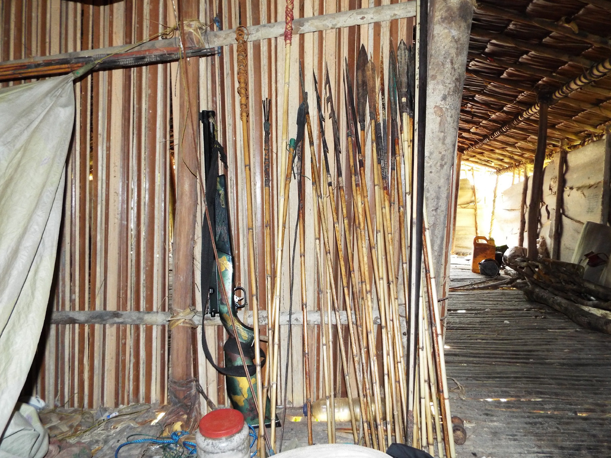 А мужчины охотятся в сумерках и ночью. Мальчишки же могут ловить рыбу с помощью копий или помогать женщинам в собирательстве. Всего в селении оказалось около двадцати человек. Это три семьи. Я так понимаю, что эти сообщества живут небольшими группами - такими, которые могут прокормиться на небольшой территории. Через год-полтора они снимаются с насиженного места и уходят в другое. Строят на дереве дом и все начинается сначала. Дома строят на высоте метров десять, но я видел дома, которые были построены и на высоте пятидесяти метров.