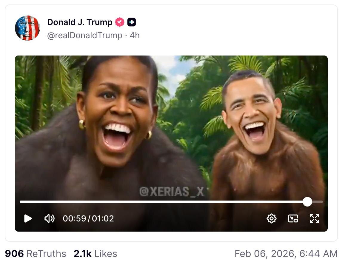 Дональд Трамп опубликовал у себя в соцсети видео, на котором присутствуют обезьяны с лицами четы Обама.