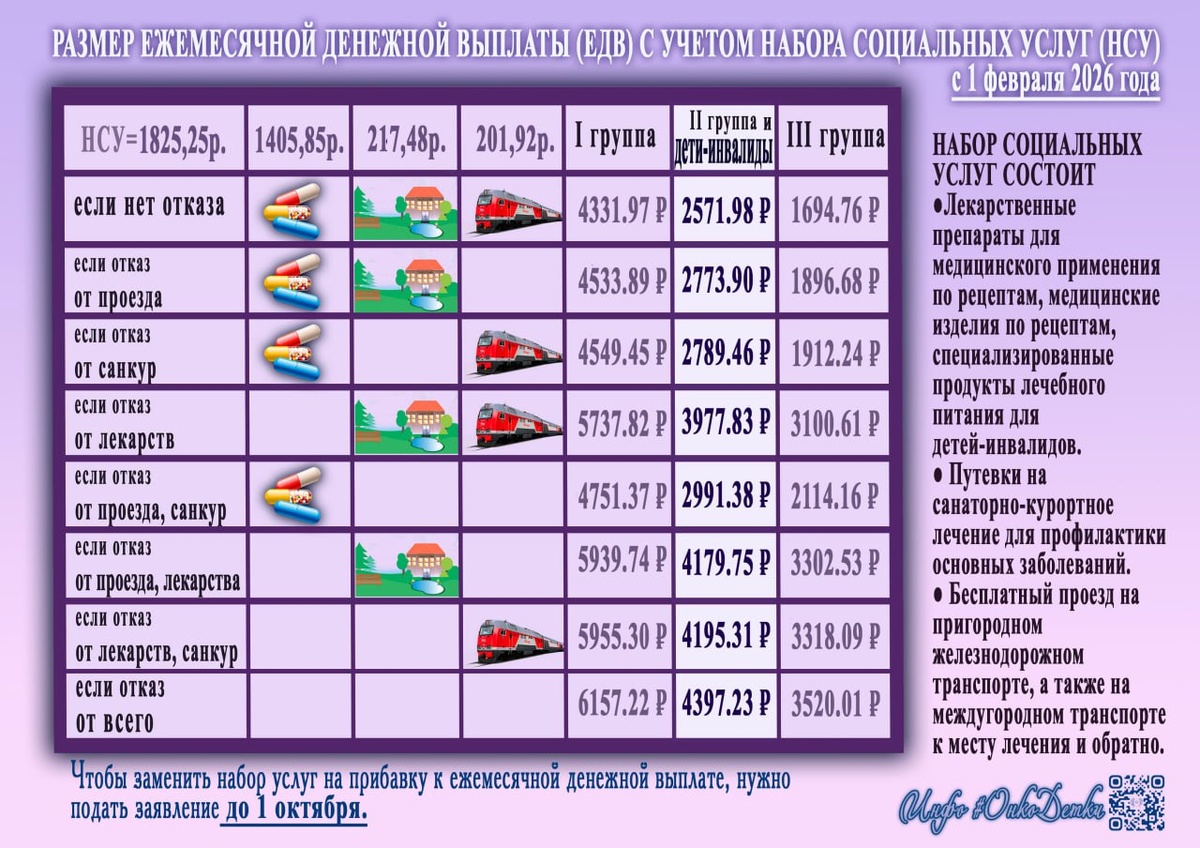 НАБОР СОЦИАЛЬНЫХ УСЛУГ (НСУ) Федеральный закон от 17.07.1999 N 178-ФЗ Глава 2. ГОСУДАРСТВЕННАЯ СОЦИАЛЬНАЯ ПОМОЩЬ, ОКАЗЫВАЕМАЯ В ВИДЕ ПРЕДОСТАВЛЕНИЯ ГРАЖДАНАМ НАБОРА СОЦИАЛЬНЫХ УСЛУГ НАБОР СОЦИАЛЬНЫХ УСЛУГ СОСТОИТ ▪️Лекарственные препараты для медицинского применения по рецептам, медицинские изделия по рецептам, специализированные продукты лечебного питания для детей-инвалидов. ▪️ Путевки на санаторно-курортное лечение для профилактики основных заболеваний. ▪️ Бесплатный проезд на пригородном железнодорожном транспорте, ▪️ Бесплатный проезд на междугородном транспорте к месту лечения и обратно. 👍 ЕДВ с учетом НСУ у детей-инвалидов (лекарства, проезд Ж/Д, санкур) с 1.02.2026г. - если нет отказа ни от чего 2571.98р. - если отказ от проезда 2773.90р. - если отказ от санкур 2789.46р. - если отказ от лекарств 3977.83р. - если отказ от проезда, санкур 2991.38р. - если отказ от проезда, лекарства 4179.75р. - если отказ от лекарств, санкур 4195.31р. - если отказ от всего 4397.23р. 🟠РАЗМЕР