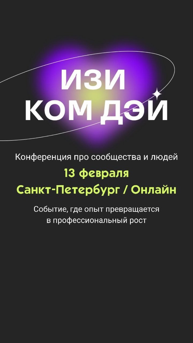 »🗣 #13февраля2026 Все мероприятия недели (с 9.02 по 15.02.2026) доступны по хештегу: #9фев_15фев26 ⏰ 11:00-20:00 📍 Пироговская набережная 7, «Особняк арх. Балинского» 💰 Стоимость от 4.900 руб по промокоду "ОГОНЬ10" скидка 10% ❗️ Регистрация 13 февраля в Петербурге пройдет классный ивент для всех, кто строит комьюнити, создает клубы и работает с объединениями людей, — конференция «ИЗИ КОМ ДЭЙ». Организатор — команда платформы для сообществ «Огонь». Эксперты комьюнити-индустрии соберутся в Питере, чтобы честно поговорить про сообщества. Почему рекомендуем? Формат. Будет стендап про факапы! Наконец-то живые истории, а не скучные лекции. Организованный нетворкинг. Команда «В одно рукопожатие» подготовила интересные механики. Польза. Реальные кейсы про то, как расшевелить людей, показать ценность сообщества для бизнеса и активировать участников Какая программа ждёт нас конференции: — Кризис доверия: Почему сообщество стало новым конкурентным преимуществом — Дискуссия «Платные