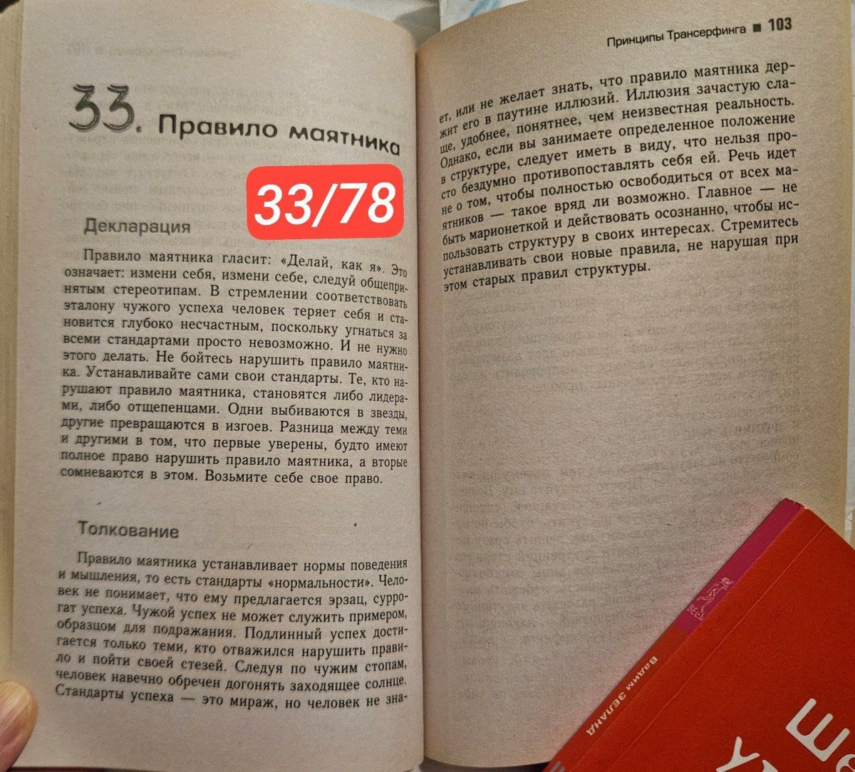 33/78 Практикум управления реальностью - Трансерфинг Правило маятника "В стремлении соответствовать эталону чужого успеха человек терят себя и становится глубоко несчастным". "Правило маятника устанавливает нормы поведения и мышления, т.е. стандарты "нормальности"." "Чужой успех не может служить примером, образцом для подражания". "Стремитесь устанавливать свои новые правила, не нарушая при этом старых правил структуры." ❣"Смотри на меня - делай как я" - как часто мы это слышим, как глубоко мы в этом. Здорово, что тренировка осознанности помогает замечать это, и всё быстрее выходить экологично из того, что не целесообразно для нас, не откликается нам, не отражает нашей истинной сути. #БлагоТворю@happy_family_way #Создаю_свой_уютный_и_кайфовый_слой_реальности@happy_family_way