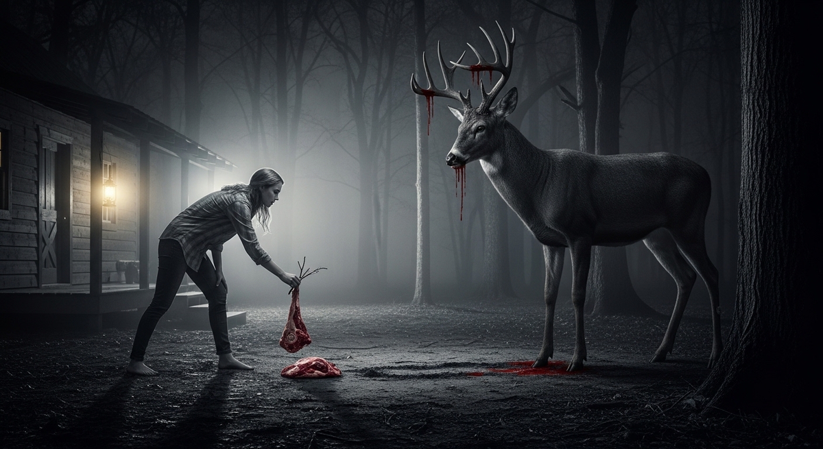 Его глаза были посажены спереди, абсолютно черные, не дающие ни единого блика, когда на них падал свет с крыльца. В плечах он был выше обычного оленя, почти вровень с ивой, рядом с которой возвышался. Пасть была неправильной: щелевидная, едва скрывающая острые зубы. Он двигал головой как кошка, наклонял её вбок как собака, стрекотал как лиса, а ступал как пума. Но самыми жуткими были ноги. Не стройные, грациозные ноги оленя, а мускулистые конечности хищника. Он рыл землю с такой яростью, что сразу становилось ясно — с такой силой лучше не пересекаться. Рога на его голове были острее, чем предусмотрено природой, а обрывки вельвета на них покрывала засохшая кровь. Наверное, это должно было значить, что он сбрасывает их, как обычный олень, но нутром я чувствовала: они приращены к черепу, как рога дьявола.