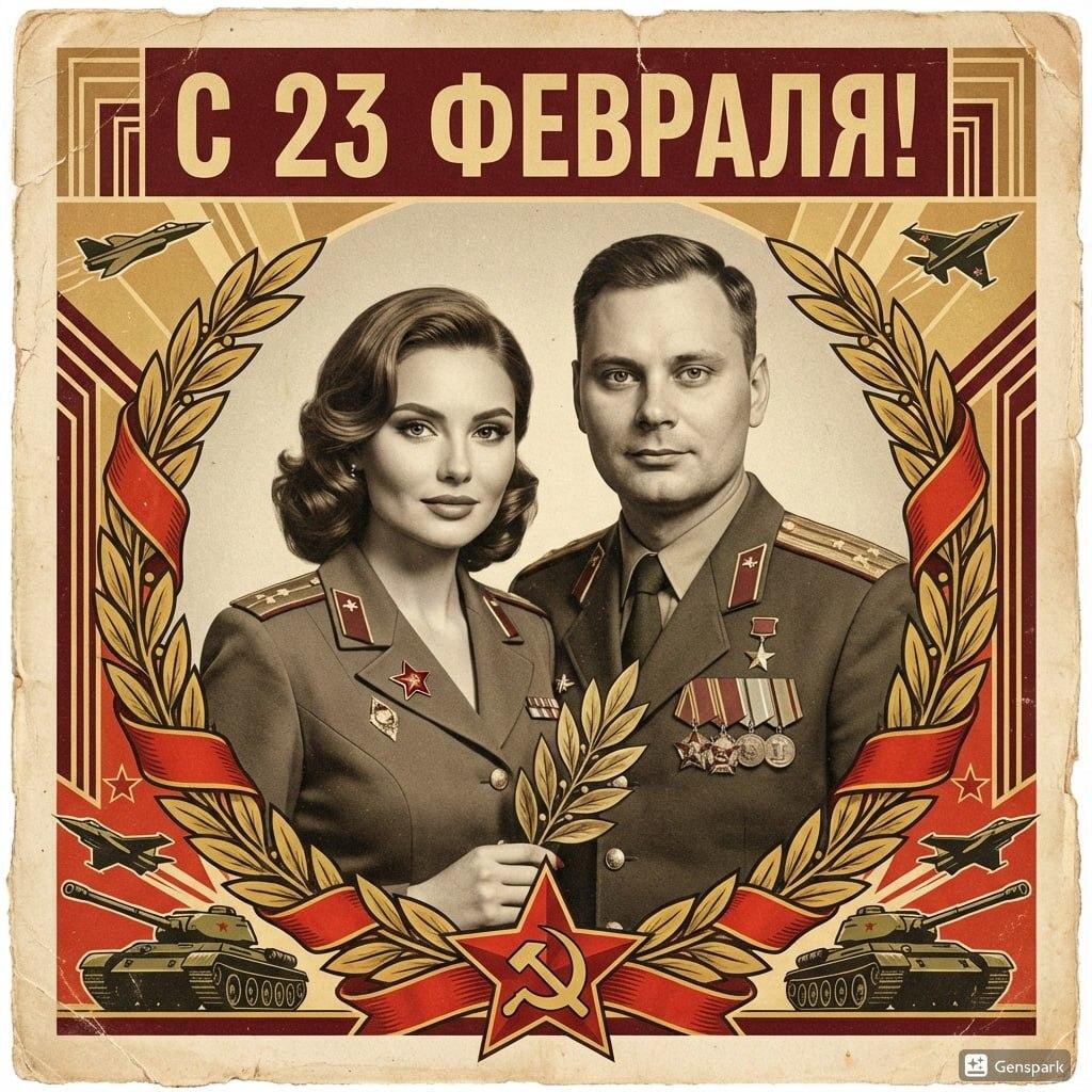 Модель: Nano Banana Сгенерировать🪄 Винтажная советская открытка к 23 февраля, стиль СССР 1960-1970-х годов, фотографическая композиция с сохранением черт лица людей с загруженных фотографий, перенести внешность и черты лица с исходных фото, сохранить узнаваемость людей с фотографий, ретро-фотография с лёгким зерном и выцветшими цветами типичными для советских открыток, центральная композиция с патриотической символикой, красная звезда, серп и молот, военные эмблемы, винтажная кириллическая типографика "С 23 февраля!", цветовая палитра: глубокий красный, золотой, военный зелёный, сепия, кремовый фон, декоративные элементы: лавровые венки, ленты, орнаментальные рамки, влияние советского пропагандистского искусства с героическим оптимистичным настроением, стилизованные иллюстрации военной техники или абстрактные геометрические узоры, эффект текстурированной бумаги с лёгким состариванием, слегка потёртые углы, влияние ар-деко смешанное с социалистическим реализмом, професси