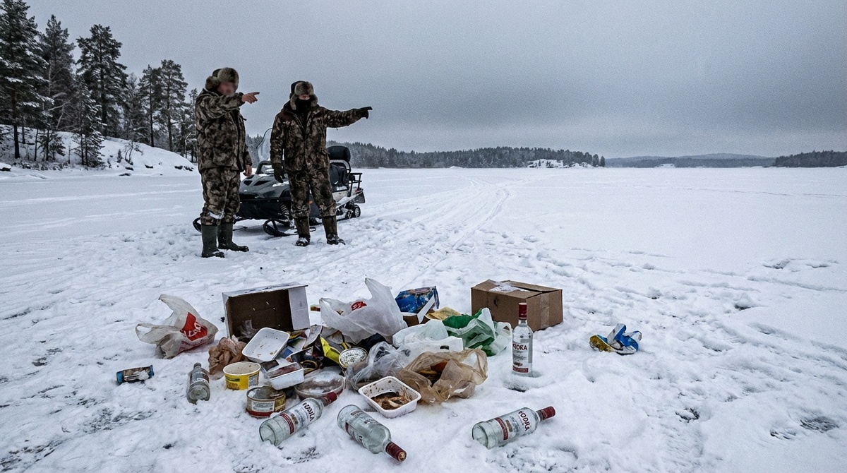 Переглянулись они с дружками. Те, что похилее были, сразу сдулись. Один из них говорит здоровяку, да ладно, Миха, реально, поехали заберем, делов-то на пять минут. Здоровяк сплюнул на лед, зло так зыркнул, но понял, что номер не пройдет. Буркнул что-то типа "ладно, сейчас уберем". Сели они на снегоход и рванули обратно. Мы за ними, в своем темпе, потихоньку на собаке поплелись. Приезжаем на наше место, а они уже там, достали мешки мусорные черные — оказывается, были у них мешки с собой, просто лень родилась раньше — и давай собирать свое добро. Мы стояли в сторонке и молча смотрели, пока последняя бутылка в мешок не улетела. Потом тот, здоровый, подошел, не глядя в глаза, буркнул "все, довольны?" и укатил к своим. А мы остались на своей законной точке.