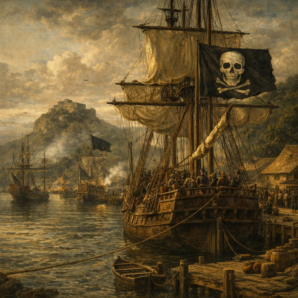 Насау на Багамах в 1715–1718 годах прожила ещё короче. После крушения испанского «серебряного флота» в 1715-м сотни пиратов собрались на острове. Бенджамин Хорниголд, Чарльз Вейн, «Калико» Джек Рэкхем, Энн Бонни — все они там отметились. Было около двух тысяч человек, выборы капитанов, общие сходки. Но никакой настоящей республики не получилось. Это была скорее оккупация: пираты контролировали гавань, торговали добычей, пили и дрались. Внутренние разборки и болезни делали своё дело. В 1718-м Вудс Роджерс прибыл с королевской амнистией и пушками — часть сдалась, часть ушла в море, Насау вернулась под британский флаг. «Республика» продержалась три года.