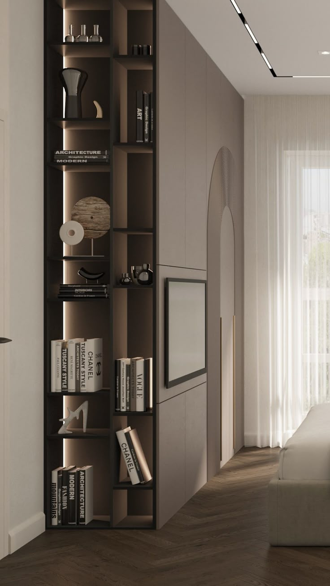 Те самые громоздкие «стенки» по всей стене вернулись, но в другой роли. Современные дизайнеры берут идею единого большого модуля для хранения и адаптируют её: делают лаконичные корпусные системы «пол‑стены» или во всю высоту, но в спокойных оттенках и с простыми фасадами.